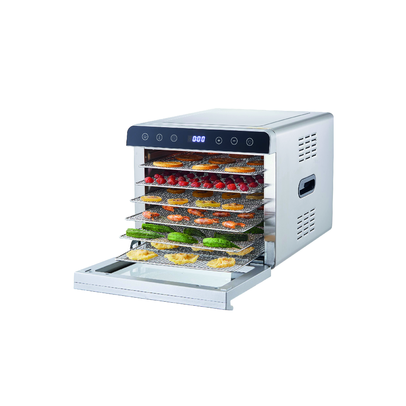 - Rango de temperatura: Ajustable entre 30 °C y 85 °C, permitiendo adaptar el proceso de deshidratación según el tipo de alimento y el resultado deseado.